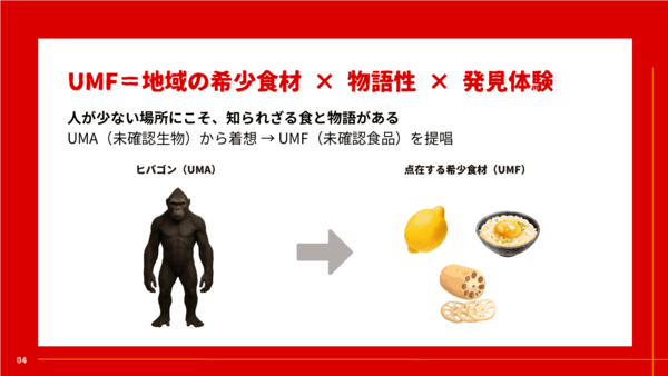 チーム「ヒバゴン応援隊」は、広島県の中山間地域を舞台にした作品「UMF(未確認食品)の謎~ヒバゴンの“幻の食の痕跡を追え!」を発表した。背景にあるのは、人口減少が進む地域に点在する郷土料理や伝説といった地域資源の価値が埋もれていってしまうという課題だ。食と物語を組み合わせ、地域の魅力を再発見できる仕組みづくりを目指した。