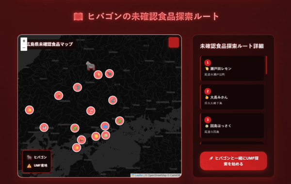 発表では、まずストーリーの設定が紹介された。広島の比婆山に伝わる未確認生物ヒバゴンが残した痕跡を追いながら、地域に眠る「未確認食品(UMF)」を探すというもの。ウェブアプリのプロトタイプでは、広島県のマップ上をヒバゴンが移動しながら郷土食や伝説の地を訪れる様子を体験できる仕掛けが披露された。