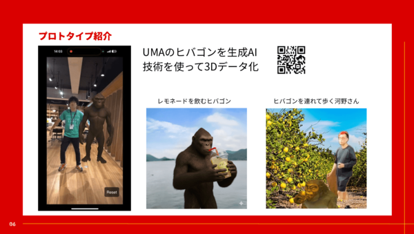 また、生成AIで作成したヒバゴンの3Dデータを使い、AR表示するプロトタイプも作成。レモネードを飲むヒバゴンや、レモン畑で一緒に写真撮影するシーンが紹介され、会場を盛り上げた。さらに、郷土料理の聞き取り調査によって知られざる食の情報が集められ、体験型観光や関係人口の増加、地域食材のブランド化にもつながる可能性が示された。