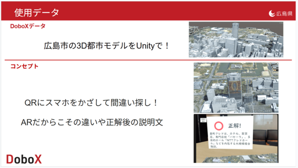 開発アプローチとしては広島市の3D都市モデルをUnityに読み込み、AR上で楽しめる間違い探しマップを作成。スマートフォンでQRコードを読み取ると3D地図が立ち上がり、建物に仕掛けられた「間違い」を探すことができる。見つけると説明文がポップアップし、その場所の特色を学べる設計になっている。