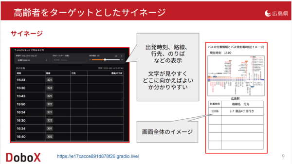 高齢者向けに提案されたサイネージでは、停留所や経由地を入力するだけで発車時刻や乗車路線、乗り場の情報が一目でわかる。特に65歳以上の人口密度が高いバス停に設置することで、高齢者の移動を支援できるとした。今後は、バスのリアルタイム運行情報や遅延情報に加え、JR・広電・アストラムラインなど多様な交通機関の情報、さらにはエリア別の増減便データの収集・統合を進める展望を示した。