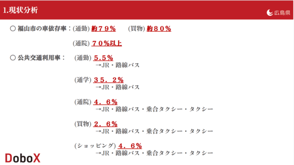 背景には、福山市での公共交通利用率の低さがある。通勤時の車利用が約79%であるのに対して、公共交通の利用はわずか5.5%。バスは利用が少ないと減便や廃線の対象となるが、実際には通学や通院、夜間の帰宅などで必要とする人が存在している。特に通学における公共交通利用率は約35%にのぼる。そこで「昼は子どもの通学や高齢者の通院」、「夜は飲食店や歓楽街からの帰宅」という2つの需要に応えることで、利用者を増やそうとするのが狙いだ。