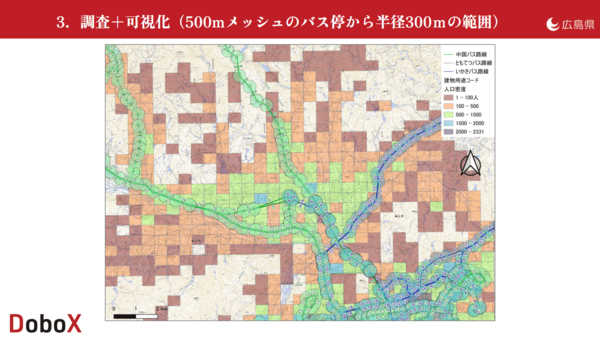 バス停から半径300メートルを利用可能範囲と定義し、DoboXのデータやPLATEAUの3D都市モデルと重ね合わせて分析したところ、人口密度が高いにもかかわらず十分にカバーされていないエリアが抽出された。バス路線は長年大きく変わっておらず、かつて農地だった地域が住宅地へと変化した結果、バス停が不足している状況が明らかになった。また、DoboXの建物現況データとホットペッパーの飲食店データを組み合わせることで、深夜に帰宅需要が見込まれるエリアも可視化した。