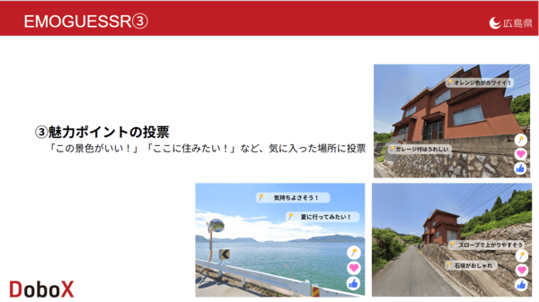 そこで提案されたのが、遊びながら地域の魅力を発見し、空き家活用を促す探索ゲーム「EMOGUESSR」。プレイヤーは、日本各地の空き家があるエリアにランダムに飛ばされ、そこで周辺地域を探索し(Googleストリートビューを活用)、気に入った建物やエリアに投票したり、魅力ポイントをコメントで共有したりする仕組みだ。これにより、従来注目されなかった土地の価値を発見し、空き家バンクへの登録や利用希望者への情報提供につなげることを目指している。