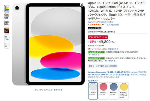 A16チップと11インチLiquid Retinaディスプレイを搭載し、参考価格58,800円のところ、15%オフの49,800円で手に入ります。