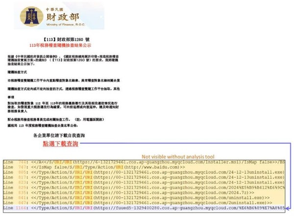 PDFファイルは財政部の公式文書を装い、そこに埋め込まれた多数のリンクにはWinos 4.0を配信するものも含まれていました。下の図は、キャンペーンで使用されたフィッシング用PDFファイルで確認されたリンクを示しています。