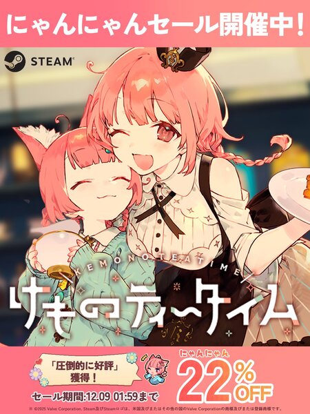 Studio Lalalaは11月25日、9月に発売したアドベンチャーゲーム「けものティータイム」について、累計販売本数が3万5000本を突破、そしてSteamレビュー評価「圧倒的に好評」を獲得したと発表した。あわせて、22%オフになる「にゃんにゃんセール」を開催すると告知している。