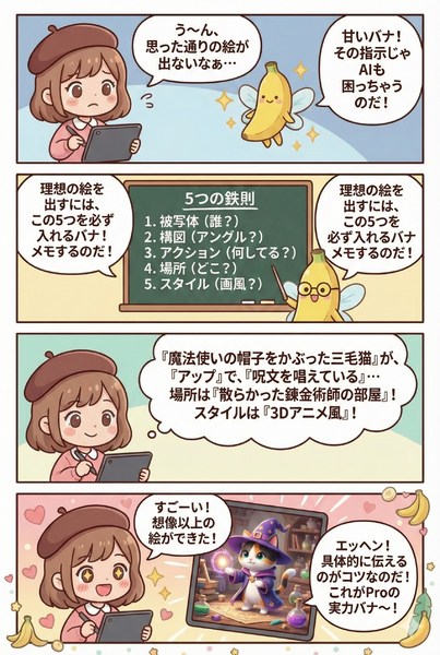 理想的な画像を生成するためには、プロンプト(指示文)に「被写体」「構図」「アクション」「場所」「スタイル」という以下の5つを具体的に含めることが重要とされている。