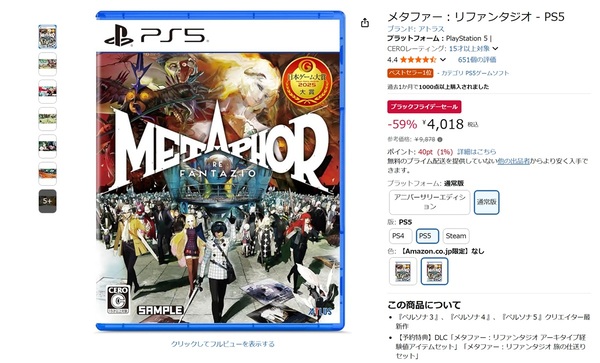 2025年12月1日まで開催中の「Amazonブラックフライデーセール」。ここでは、アトラスより発売中の人気RPG「メタファー:リファンタジオ」がお買い得だったので紹介していこう。