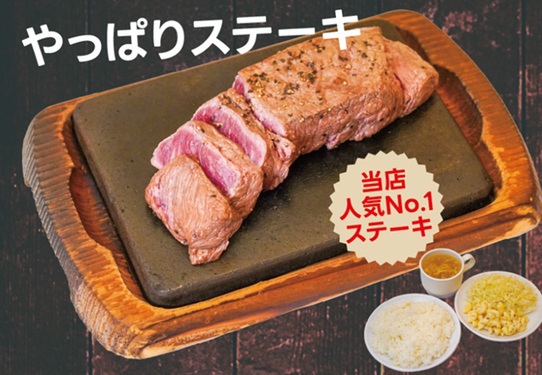 目玉企画として、溶岩石で焼き揚げた人気メニュー「やっぱりステーキ」100gを、通常1500円のところ1290円で提供。ごはん、スープ、サラダ食べ放題が付きます。