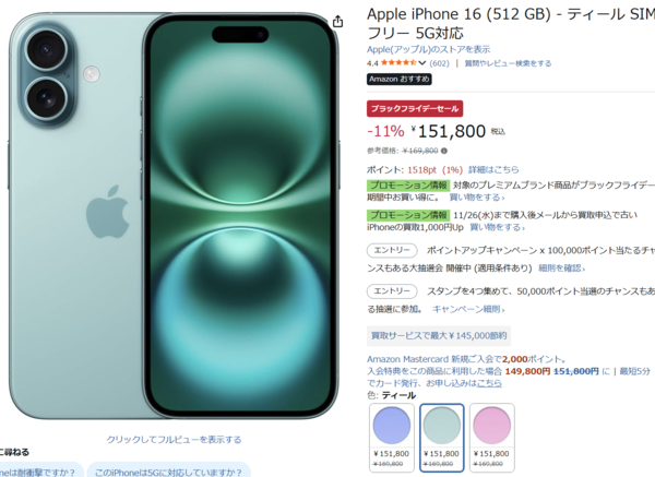 5G対応、512GBの大容量ストレージを備えたiPhone 16が、参考価格169,800円のところ、11%オフの151,800円というお買い得価格に!