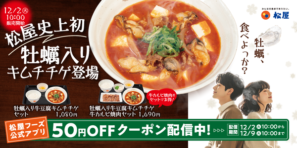 牛めしの松屋は「牡蠣入り牛豆腐キムチチゲ」を12月2日10時より発売します。