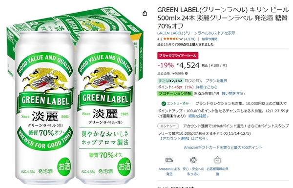 【Amazonブラックフライデー】淡麗グリーンラベル 500ml×24本が登場!