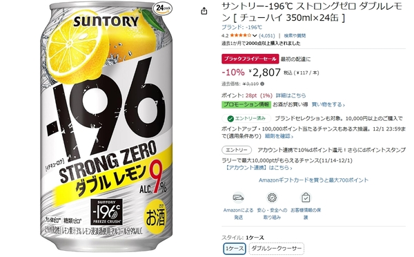 Amazonブラックフライデーにて、強めの缶チューハイ「サントリー-196℃ ストロングゼロ ダブルレモン 350ml×24缶」が登場しています。