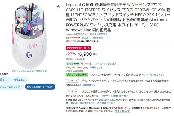 「Amazonブラックフライデー」にて、ロジクールGと『原神』がコラボしたワイヤレスゲーミングマウス「神里綾華特別モデル(G309 LIGHTSPEED G309WL-GE-AYA)」がセール対象になっている。