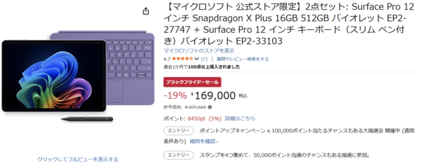Amazonブラックフライデーセールは12月1日まで。ブラックフライデーでは、会期途中でセールが終わったり在庫がなくなったりする商品も少なくありません。この記事で紹介しているSurface Pro 12インチ+キーボードセットは、記事執筆時点では19%オフのブラックフライデー価格が継続中。気になっていた人は、価格が戻る前に一度商品ページを確認しておくのがおすすめです。