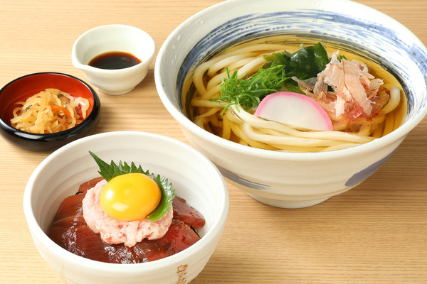 人気のまぐろ丼をアレンジした新作です。しっとりとした食感の「漬けまぐろ」と、口の中でとろける「まぐろたたき」の2つの食感を一度に味わえる構成で、温うどんまたはざるうどんが付きます。