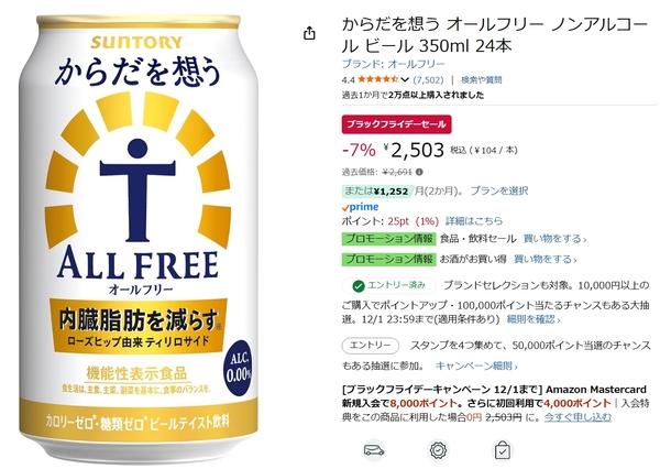 サントリーのノンアルコール飲料「からだを想う オールフリー 350ml×24本」が、Amazonブラックフライデーの対象商品になっています。