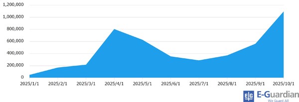「ミャクミャク」話題量 月次推移(2025年1月1日~2025年10月31日:リポスト込み)