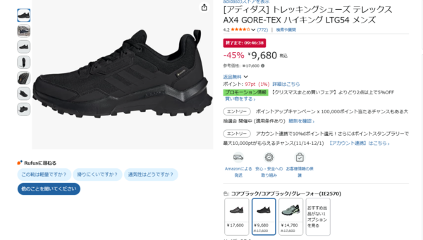 アディダスの人気トレッキングシューズテレックス AX4(25.0cm)が45%OFFの9,680円で、11月24日(月)開始のAmazonブラックフライデーセールに登場しています!