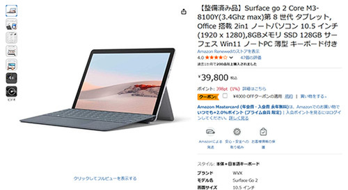 クーポン適用で4000円引きに。お得に購入できるこの機会に、Amazon整備済み品のSurface Go 2を検討してみてはいかがでしょうか。