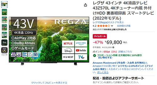 REGZA(レグザ)の43インチ 4K液晶テレビ「43Z570L」(2022年モデル)が、Amazonタイムセールに登場しました。