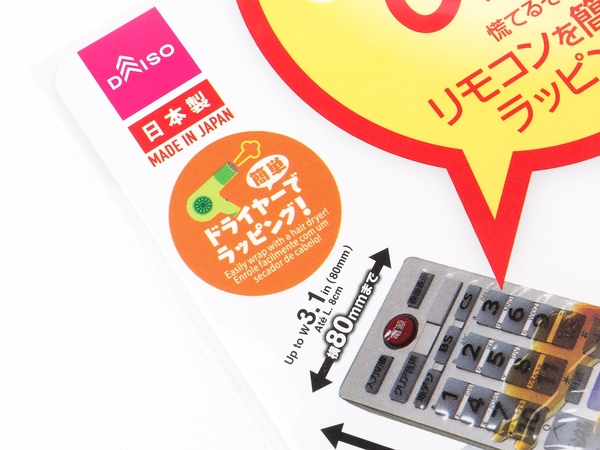 ダイソーで売っているリモコン用ラップフィルム。ドライヤーを使えと書いてあります
