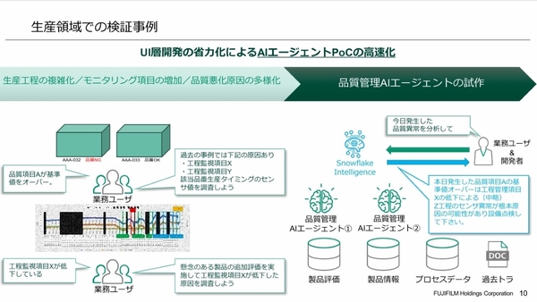 生産工程の現場では、データに基づく品質管理が行われている。しかし、商品の多角化により、モニタリングする項目や品質の悪化原因は増え続けていた。そこで、品質異常を分析するエージェントを開発し、検証するというサイクルを繰り返しているところだ。「Snowflake Intelligence上で素早くエージェントを切り替え、検証作業の効率化を図れる」(三ツ井氏)