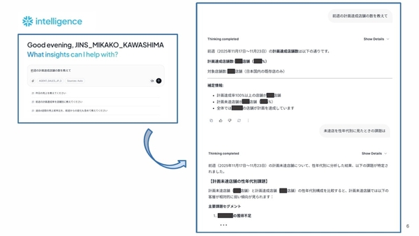 最後は、アイウェアを手掛けるジンズ(JINS)の事例だ。同社は2024年に“AI元年”を宣言。AI活用を推進するための施策のひとつが、Snowflake Intelligenceによる「売上分析エージェント」の開発である。