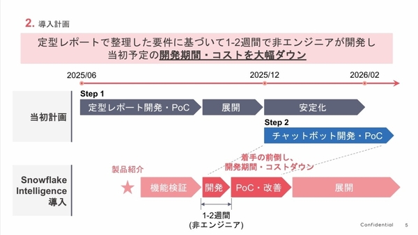 最初のステップとして、定型レポートに対して生成AIが回答する仕組みの検証に着手したが、その最中にSnowflake Intelligenceが登場する。最終形とする対話型を前倒しで構築でき、非エンジニアでも短期間でエージェントを開発できることから、同サービスの利用に切り替えた。