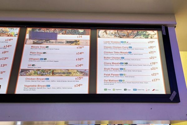 カレーは定番のチキンカレーやバターチキンのほか、チャナマサラやパニックパニールもある。ドーサも、ビリヤニもあるので正直迷ったが、基本であるクラシックチキンカレーを頼むことにした。お値段は約20ドルということなので、日本なら少なくとも2食は食べられる3000円。もはや何も言うまい。