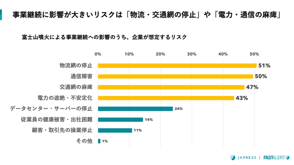 富士山噴火によって懸念される影響としては物流網の停止、通信障害、交通網の麻痺、電力の途絶・不安定化などが挙がっており、サプライチェーンや社内外とのコミュニケーションにおよぼす影響に企業が懸念を示していることもわかった。
