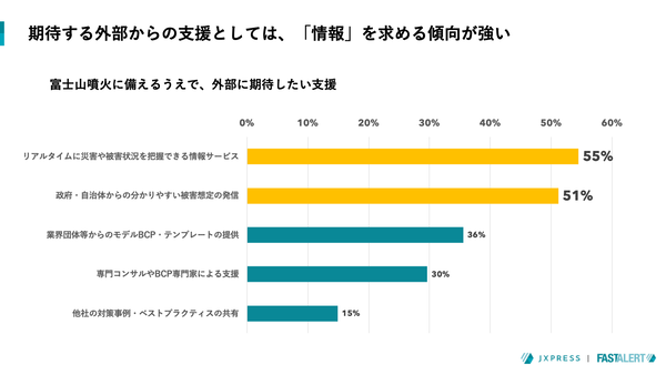 企業側が対策として期待する外部支援は、被害状況を把握できる情報サービスや政府・自治体による被害想定の発信といった「情報」の提供に対するニーズが高い結果となった。