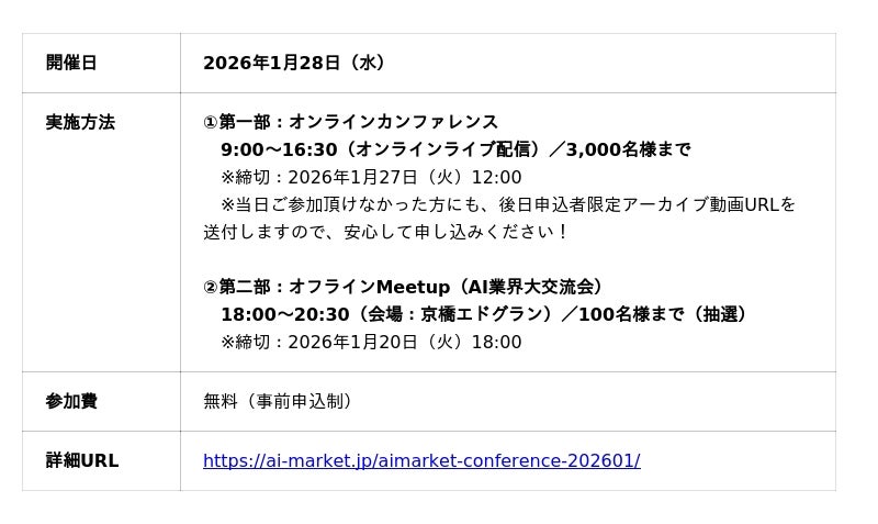 最適なAI会社やAIサービスの選定を支援するコンシェルジュサービス「AI Market」を運営するBizTech株式会社(東京都豊島区、代表取締役 森下 佳宏)が主催する、1月28日開催の国内最大級AIカンファレンス『AI Market Conference 2026』に登壇するウイングアーク1st株式会社 大畠 幸男氏の講演内容をお知らせ致します。