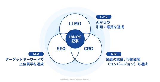 そこでLANYは、コンサルティング会社として蓄積したSEO×LLMO×CROの知見を活かし、SEOでの上位表示の獲得に加え、AIへの学習材料として機能すること(LLMO/大規模言語モデル最適化)、さらに訪れたユーザーのアクションを適切に喚起すること(CRO)を実現する「AI時代に最適化した記事制作」として「SEO/LLMO記事制作代行サービス」をリリースいたしました。