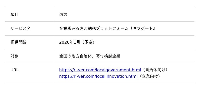 官民連携による地域課題解決を支援する株式会社river(本社:東京都品川区、代表取締役:小坪拓也)は、企業版ふるさと納税における企業と自治体のマッチングプラットフォーム『キフゲート』を2026年1月より正式にリリースいたします。