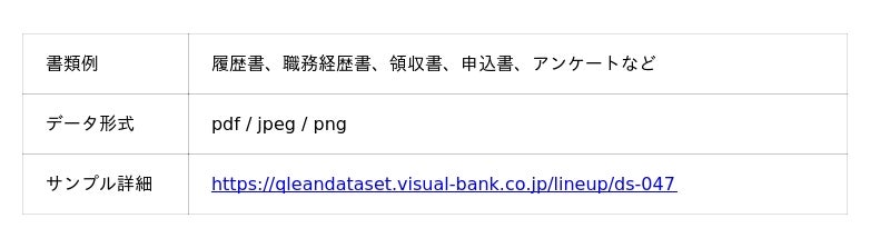 本データセットは、Qlean Datasetが展開する機械学習用データセットラインナップ『AIデータレシピ』の新たなラインナップとして提供するもので、履歴書、職務経歴書、領収書、申込書、アンケートなど、実際の業務プロセスで日常的に扱われる書類を対象としたドキュメントデータで構成されています。