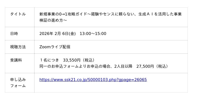 株式会社CINCA(本社:東京都港区、代表取締役社長:阿部 拓貴、以下「当社」)は、2026年2月6日(金)に、新社会システム総合研究所が運営するオンラインセミナー「新規事業の0→1攻略ガイド~経験やセンスに頼らない、生成AIを活用した事業検証の進め方~」に登壇することをお知らせします。