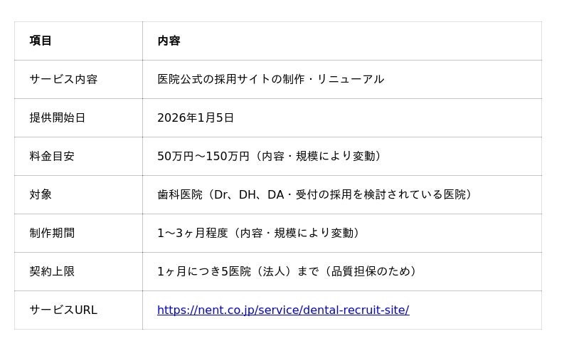 ネント合同会社(所在地:神奈川県横浜市)は、2026年1月5日より、歯科医院向け採用サイト制作サービスの提供を開始いたしました。