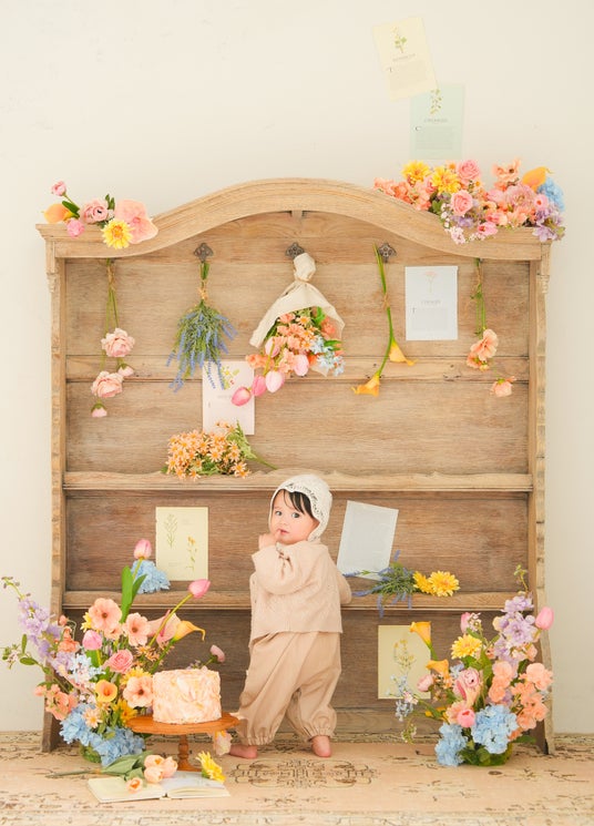 唯一無二の世界観でファンの多いフォトグラファーMizukiが手がけた、こだわりの木製シェルフ(棚)と軽やかな淡い色味の花であしらった、ナチュラルで華やかさもある空間で、お子さまのイマしかない瞬間を写し取る撮影体験をお届けします。