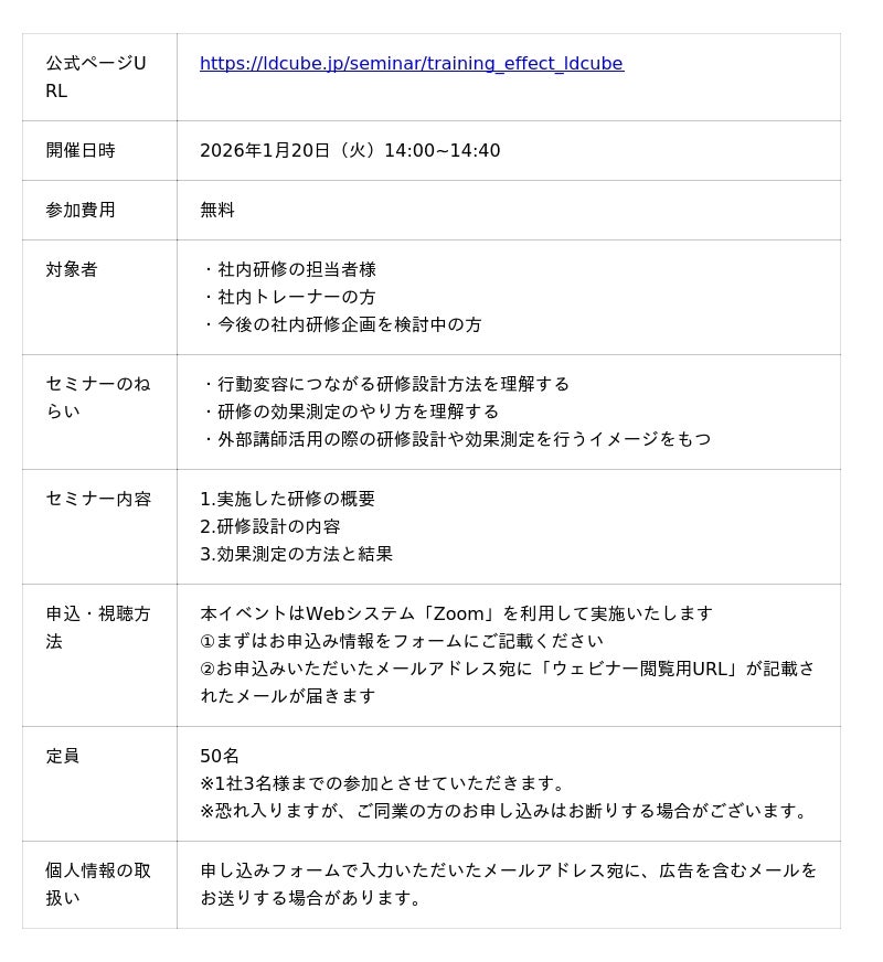 「【事例解説】外部講師による研修の効果測定を実施!研修設計と研修効果を公開!」ウェビナーを開催(1月20日14:00~14:40)株式会社LDcube
