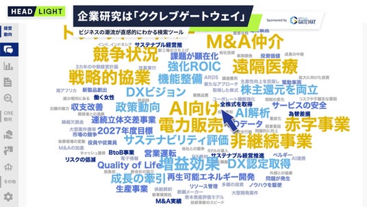 ククレブゲートウェイでは、有価証券報告書や中期経営計画を独自に分析し、企業や業界の戦略を表すキーワードを視覚的に表示する「ホットワード分析」機能を提供しています。- 企業名・業界名で簡単に検索