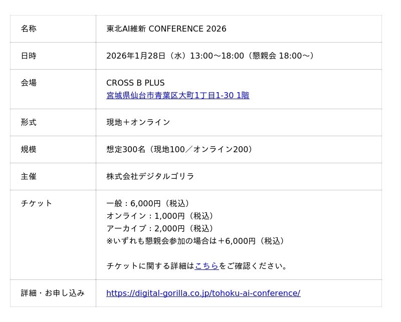 「東北AI維新CONFERENCE 2026」公式サイト:https://digital-gorilla.co.jp/tohoku-ai-conference/