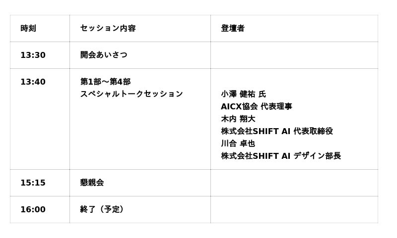 株式会社SHIFT AIは、「日本をAI先進国に」というミッションのもと、生成AIをはじめとするAI技術のビジネス活用を学べる、利用者数No.1※の生成AI学習コミュニティ「SHIFT AI」を運営しています。会員数は2万5000人を超え、法人向けのリスキリング支援サービス「SHIFT AI for Biz」や、教育機関向けの「SHIFT AI for School」など、幅広い分野でAI人材の育成を推進。さらに、独自メディア「SHIFT AI Times」の運営をはじめ、情報発信・研修・イベントを通じて、個人と組織の成長を支援し、日本全体のAI活用を加速させています。