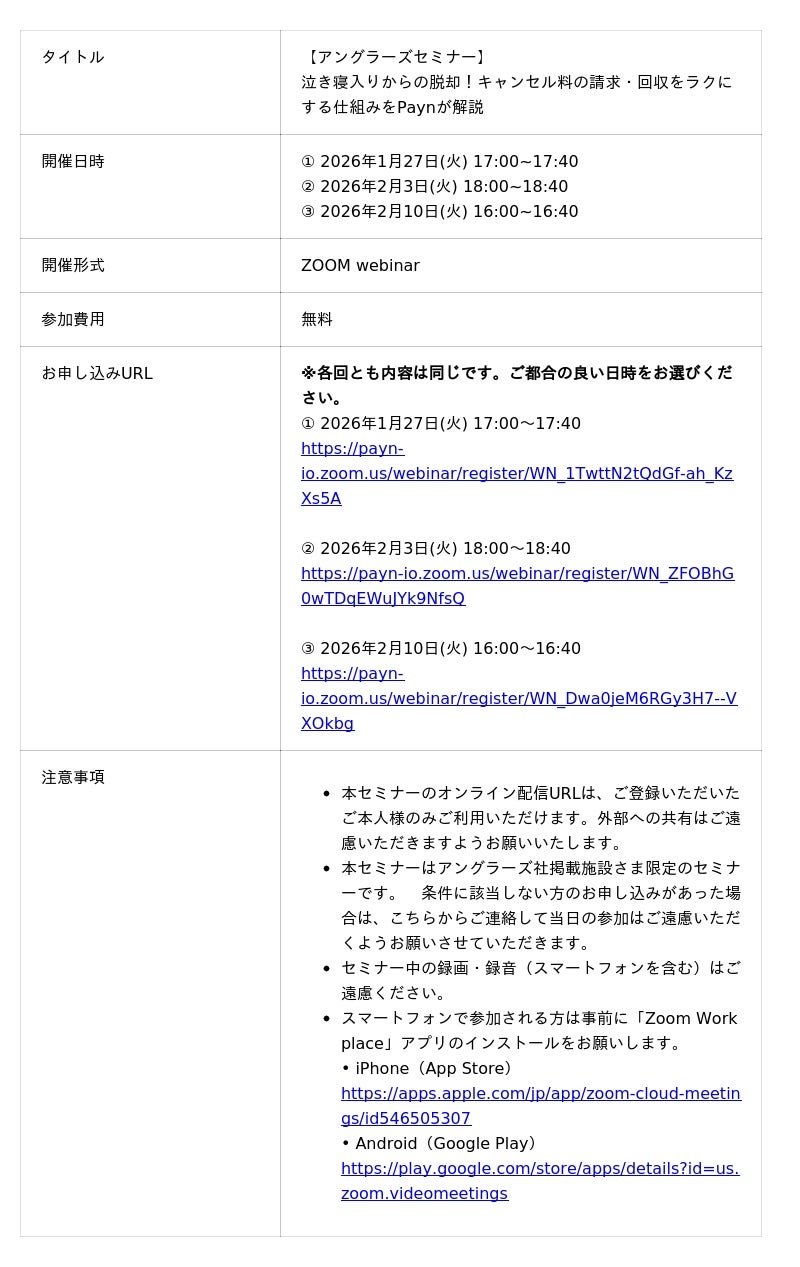 当社は、宿泊施設、飲食店など、キャンセルポリシーを設ける事業者向けに、キャンセル料の請求および回収業務を自動化する請求ツール「Payn」( https://payn.io )を提供しています。