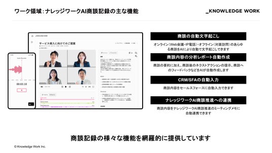 セールスイネーブルメントAI「ナレッジワーク」の主要プロダクトの一つである「ナレッジワークAI商談記録」は、オンライン商談に加え、対面でのオフライン商談も録音・録画し、AIが話者ごとに発言を可視化した文字起こしを実施します。加えて、商談内容の要約やタスク提示、フィードバックを生成し、CRM/SFAに自動入力。他のプロダクトである「ナレッジワークAI商談推進」とのシームレスな連携により、蓄積データの活用精度を高め、営業組織の生産性向上と営業担当者の成長実感・貢献実感の向上を実現します。
