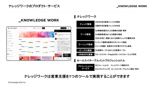 ナレッジワークは現在、現場で働く一人ひとりのイネーブルメント(成果創出や能力向上)の実現を掲げ、セールスイネーブルメントAI「ナレッジワーク」として「ナレッジ」「ワーク」「ラーニング」「ピープル」の4領域でマルチプロダクトを展開・拡充しています。営業領域では、これまで蓄積してきたイネーブルメントメソッドとデータをもとに、営業担当者の様々な仕事を自律的に支援を行うセールスAIエージェントの開発を進めています。