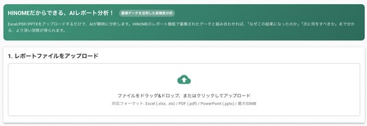 本機能は、ユーザーが普段作成している分析レポート(Excel、PowerPoint、PDF形式)をアップロードするだけで、HINOME AIが約1分という短時間で内容を解析。データ分析結果の解説から、アカウントの傾向値の抽出、そして次に繋がる具体的なアクションプランの提示までを自動で行います。