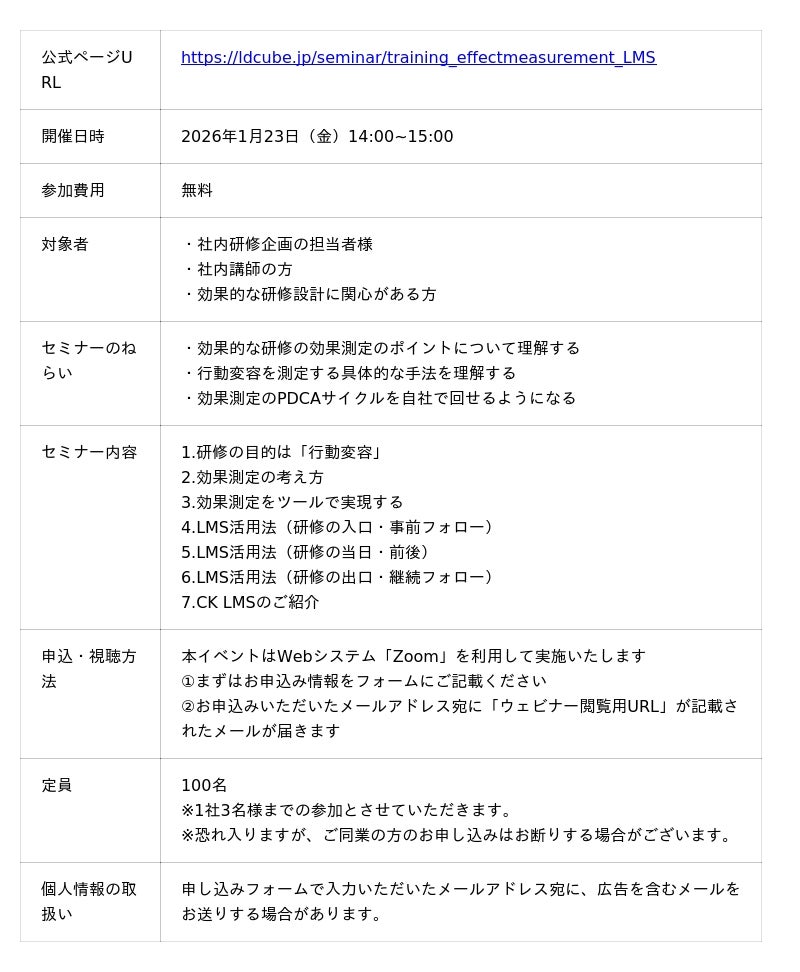 「【LMS×研修の効果測定】明日から使えるLMS活用術!~効果を実感できない研修から脱却する方法~」ウェビナーを開催(1月23日14:00~15:00)株式会社LDcube