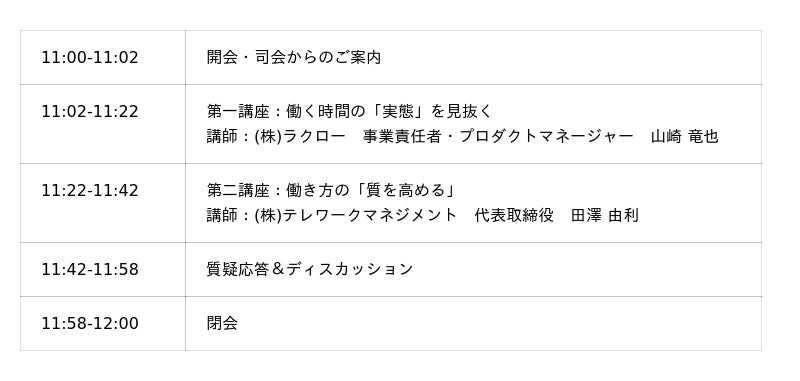 株式会社ラクロー(本社:神奈川県相模原市、代表取締役:岩崎 奈緒己)は、株式会社テレワークマネジメント(本社:北海道北見市、代表取締役:田澤 由利、以下 テレワークマネジメント)と共同で、2026年1月27日(火)に無料オンラインセミナー『【2026年の労務戦略】働く時間を「見抜き」、働き方の「質を高める」』を開催いたします。